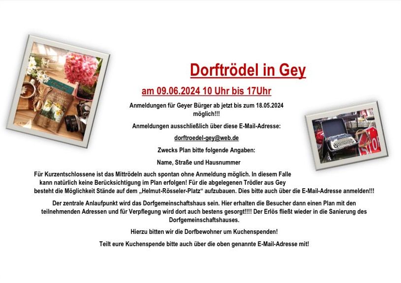 Die nächste Veranstaltung wirft bereits jetzt schon ihre Schatten voraus: am 9. Juni findet in diesem Jahr der Dorftrödel in Gey statt!