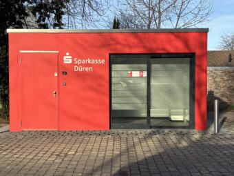 Direkt neben dem Gebäude hat die Sparkasse einen SB-Pavillon errichtet, in dem ein Geldautomat sowie ein Kontoauszugsdrucker stehen.
